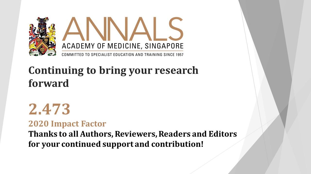 Annals, Academy of Medicine, Singapore is excited to announce its latest Impact Factor of 2.473 for 2020, and 5-year Impact Factor of 2.42. View more